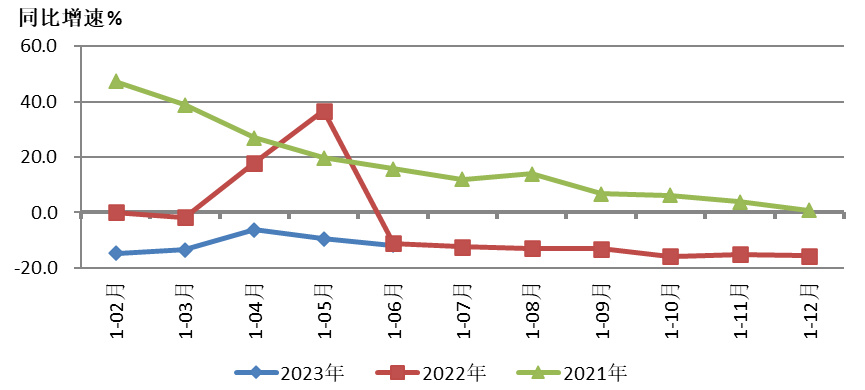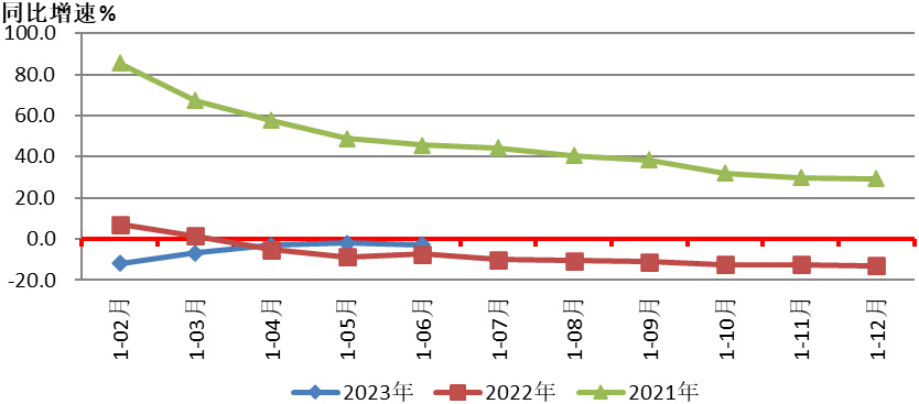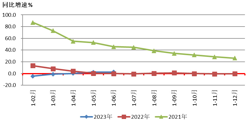 图1是2023年1-6月和2022年、2021年重点联系企业营业收入同比增速情况的对比。
