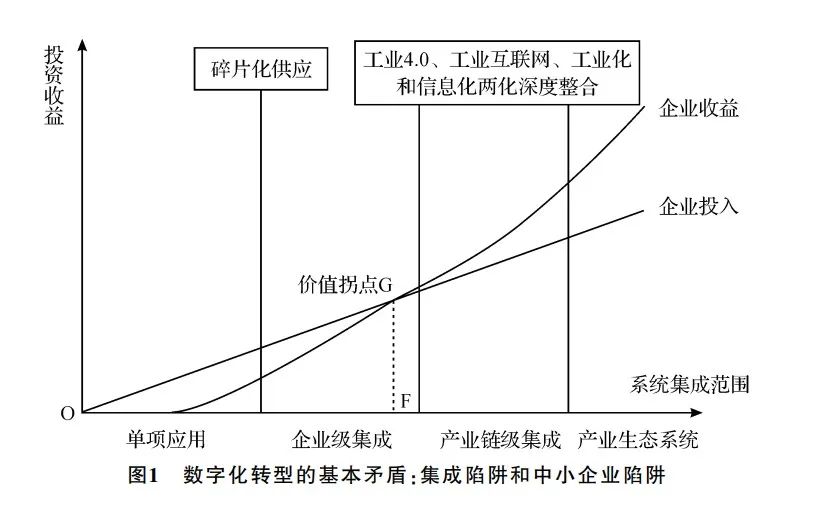 综上所述,对于制造业数字化改造障碍的认识,国内外学者和企业实践者基本达成一致:数字化转型存在两大基本矛盾,即集成陷阱和中小企业陷阱。“所谓‘集成陷阱’是指企业管理信息的全局优化需求与碎片化供给的矛盾。具体表现为企业在工业化和信息化融合发展的初期阶段,各个职能部门各自搞了许多信息系统,却鲜见信息系统间的连接与集成,最终成为一个个‘信息孤岛’”。一般认为,数字化改造只有突破了集成陷阱(突破图1价值拐点G),企业才会进入工业化和信息化两化深度融合发展的高级阶段,进而进入实质性受益阶段。而“所谓‘中小企业陷阱’是指对于广大中小企业来说,由于缺资金、缺人才,对数字化转型大都抱有‘不敢转、不愿转、不能转、不会转、不善转’的态度;即使有勇于尝试者,也大都在没有超越前期沉没成本(图1中OF段)、尚未突破“集成陷阱”、数字化改造效果尚未显现前消耗完了所有的资源。”