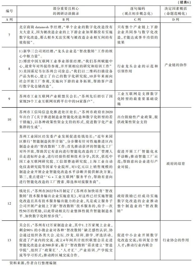 随后,在初步概念化的基础上,继续按照纵向产业链上各参与者观点,对数字化改造的决定因素这一命题进行范畴化,参见表6D列,整个范畴化过程的分析如下: