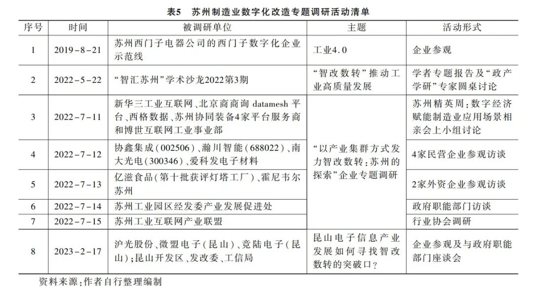 苏州规上企业工业总产值2021年末到达41308.1亿元,全国城市排名第二;根据工信联《全国两化融合发展水平区域比较》,江苏省工业化和信息化融合发展水平连续七年位居全国第一,而苏州又在“两化融合”方面的成绩全省领先;苏州在中国获评“灯塔工厂”数量的城市排名第一(表2)。为此我们课题组6人(其中3位教授,3位博士)历时三年半,长期跟踪工业4.0和制造业数字化改造实践,并在苏州当地开展了一系列调研活动,参见表5。