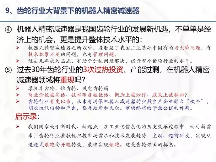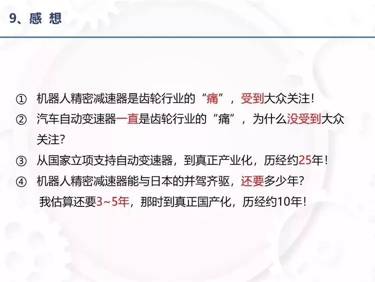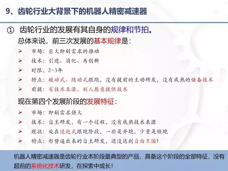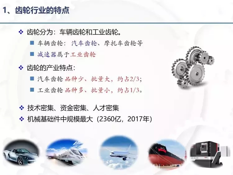 我们先从齿轮行业的大背景下来看精密减速器。齿轮行业在零部件里是最大的行业,有自身的发展规律和技术进展节拍。先给大家普及一下齿轮行业的概念,齿轮就分两种,我们书上讲很多,齿轮就是两种,工业齿轮和车辆齿轮,齿轮行业的特点可以总结为以下这些: