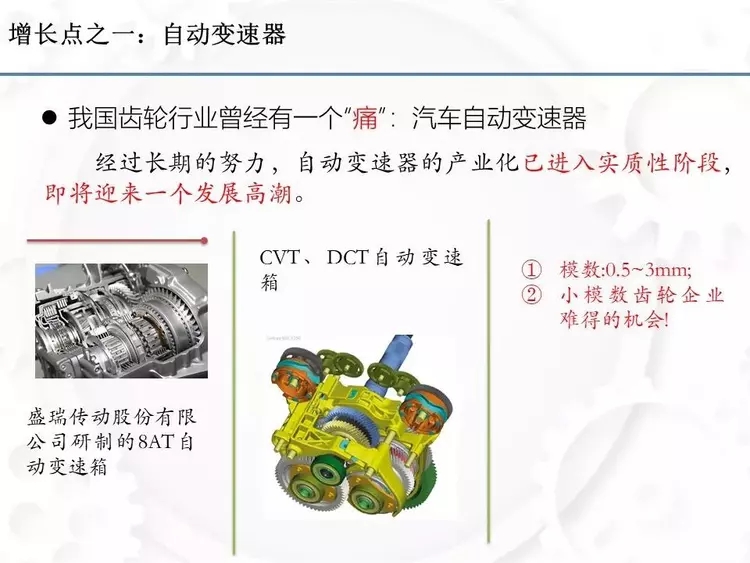 第四次增长的增长点主要在3个领域:第一是汽车自动变速器;第二是精密减速机;第三是轨道交通用齿轮箱。目前齿轮行业在这三个点上风口比较多。