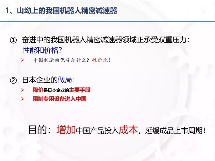 现在机器人精密减速器行业处在双重压力之中。感觉日本人在给我们做“局”,知道中国的东西快出来了,就开始降价,你做的成本比他的销售价还高,让你没办法卖出去,憋得你很难受。第二个是限制相关专用设备进入中国,逼你中国买价格昂贵多的瑞士和德国设备,就是加大你投入成本,让你成本下不来,延迟你产品上市。