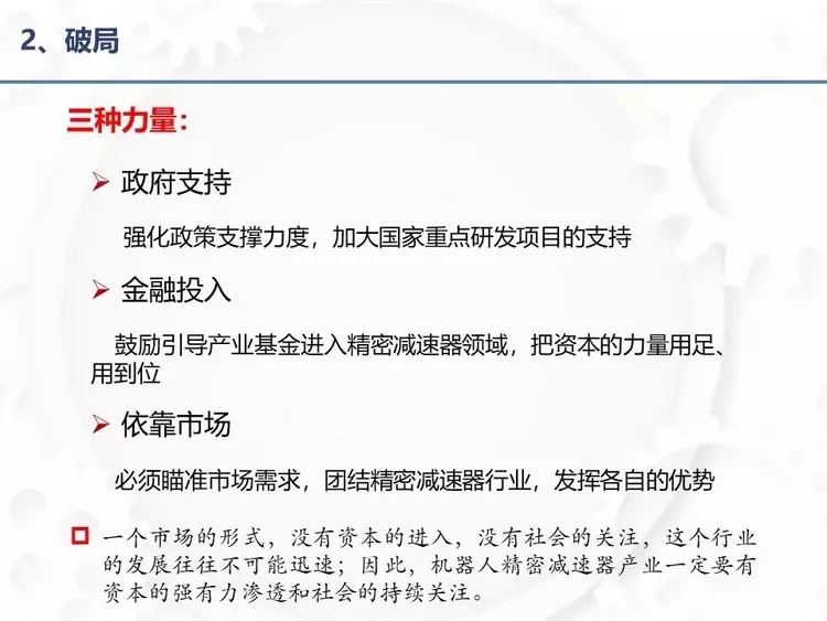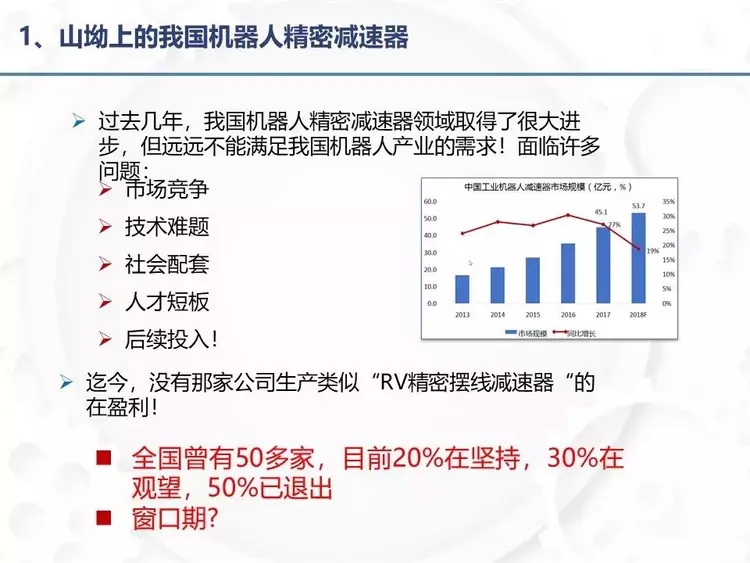 下面我讲问题和对策,主要是讲一些共性问题。潮起潮落一批企业退出去了,这很正常,近来机器人精密减速器的投入在下降,是回归到理性了吗?已经走过了喊口号的阶段了,现在很多企业是实实在在干活,大浪淘沙留下来的才是金。