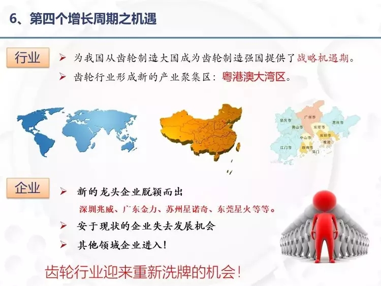 第四次增长给大家带来了新的机会,我国也将从齿轮大国成长为齿轮强国,将形成新的产业聚集区。对企业来说,是一个重新洗牌的机会,很多龙头企业会脱颖而出。