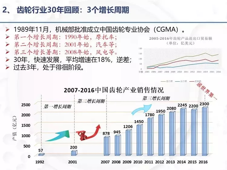 机械零部件有很多种,如轴承、紧固件、模具等等,但齿轮行业的产值是最大的,2017年达2360亿,轴承只有1800多亿。过去30年,中国齿轮行业经历了3个增长周期,总体上30年来齿轮行业都增长很快,但是2014、2015、2016徘徊了三年。齿轮行业还有一个特点,在中国制造走向世界过程中,齿轮行业体现的是逆差,这点我后面再讲。