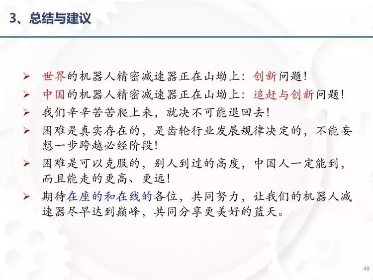 世界的机器人精密减速器正在山坳上,是创新问题。中国的机器人精密减速器正在山坳上,是追赶与创新问题。我们辛辛苦苦爬到这里,是退不回去了。困难是真实存在,是齿轮行业发展规律决定,我们不要妄想一步跨越必经阶段,不管怎么样人家到过的高度中国人一定能到,让我们在座的各位一起努力,让我们的机器人减速器尽早达到最高的巅峰。谢谢!