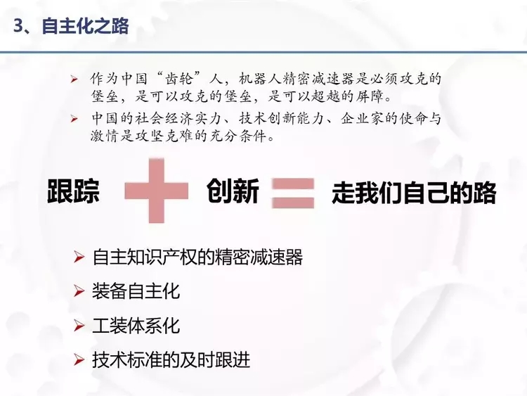 我们是一个大国,我们必须走自主化之路。我们自主化之路应该是几个方面,一个还是要有自主知识产权,减速器必须有自主知识产权。第二是装备的自主化。