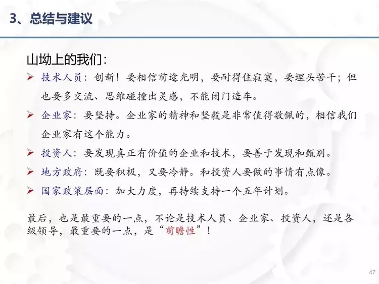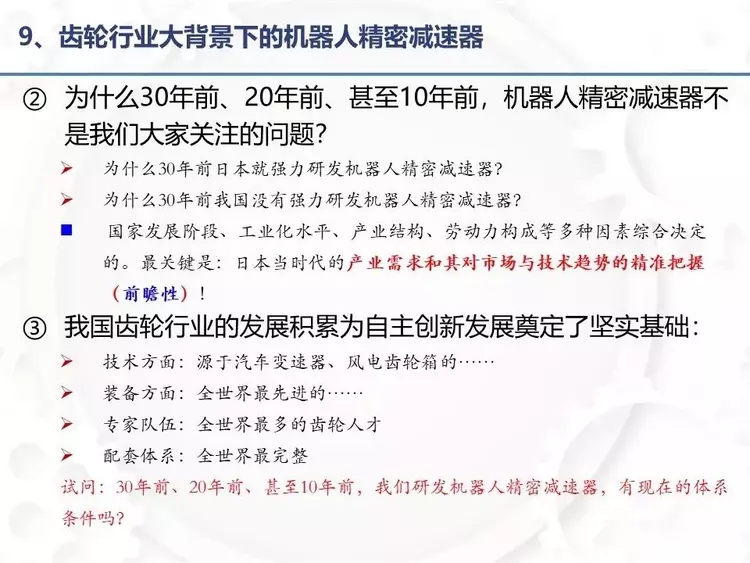 想想这个问题,为什么30年前,1980年代,我们没有和日本同时开始下功夫研究机器人精密减速器?说白了我们还是没有这个产业需求,10年前中国的劳动力还没有这么贵,我们没有前瞻性。现在实际上整个行业在补课,补20年前、30年前的课,我们研究的产业的、风投的等等,都是在补课。
