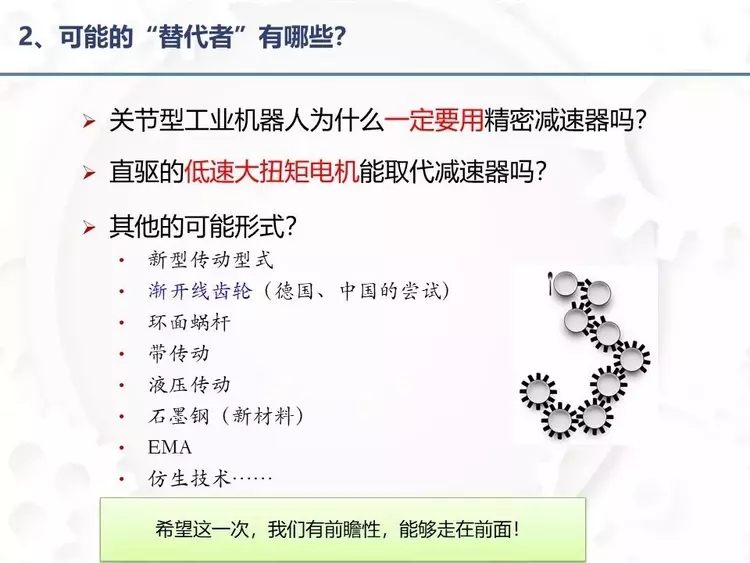 工业机器人就一定要有减速器吗?这个问题我们在国内争论了好久,到底为什么一定要用?现在的结论是,工业机器人减速器其实是不可替代的,在目前阶段。所以现在很多人在探讨这个问题。