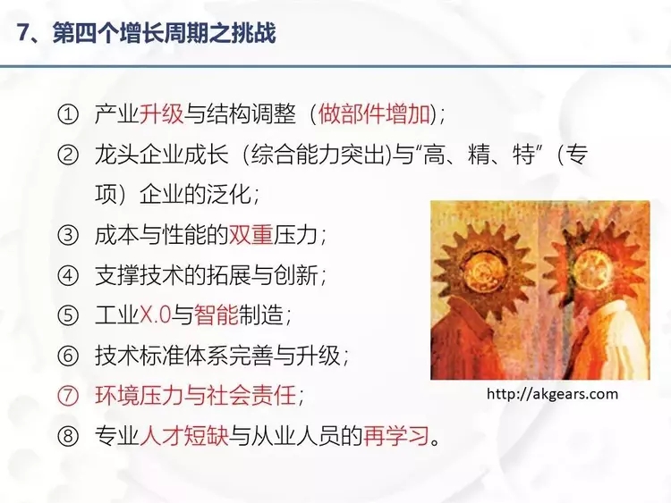 那么第四次增长有什么特点呢?前三次基本上是引进、消化、再创新,现在减速器技术只能靠自己研发了。第四次增长的特点,一是自有技术,二是综合性。在座的很多搞研究的,这是一个很好的机会,减速器行业的专家收入都很高,这个领域的机会还是蛮多的。综合性体现在技术、装备、人才、管理等多个方面,而不是依靠单要素的。