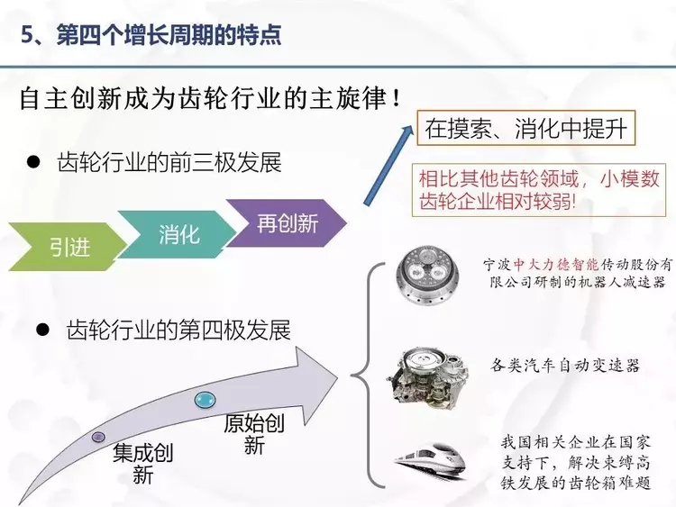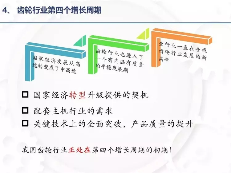 现在,经过三年的徘徊,由于国家转型升级政策和齿轮行业技术突破等等,齿轮行业迎来了第四个增长周期。所以现在是风投齿轮行业的一个好机会,因为整个大周期已经开始了。