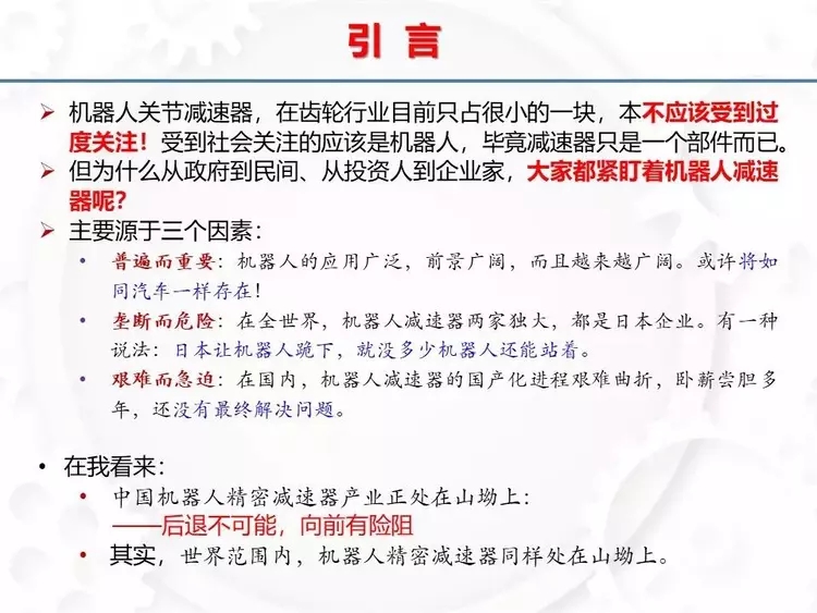今天我讲三个问题,首先做一个远眺与近观,看看山坳上的减速器;再讲讲我们所面临的问题与对策;最后讨论一下这个行业的创新与发展。