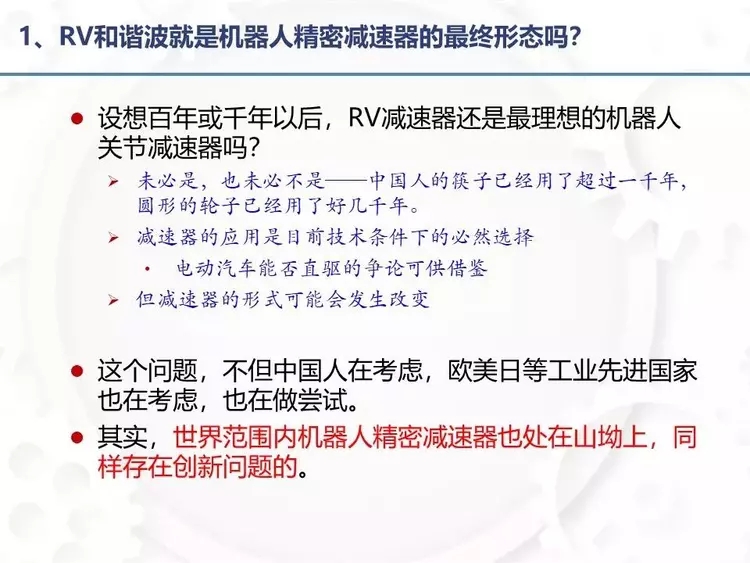 这段话是我写的:10年以后、100年以后,1000年以后RV还是不是最理想的关节减速器,RV减速器以后,是不是机器人最终的形态?就像筷子一样,筷子一千多年前就有了,还是两根棍子。我感觉到减速器现在这种形态肯定是要改变的,它本身存在着一些问题,那么复杂,要求那么高,带来了方方面面的问题,说不定哪天一个前瞻的出现把这些东西都改变了。