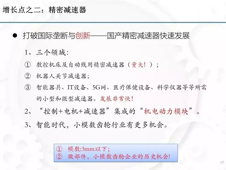 增长点之二就是精密减速器,涉及面很宽。数控机床曾经连齿轮都没有更别说减速器了,现在高档数控机床都带有精密减速器,因为添加减速器能提高整个机床的动态性能。此外自动化生产线对减速器的需求也很大。这个市场国内发展很快,空白点也很多,现在成规模进口;再一个是机器人的关节减速器;还有智能器具和IT设备对精密减速器的需求,也是风投最热的一块。比如全屏手机的镜头,就是由微小减速器驱动弹出的,各种密码锁也对减速器有巨量需求;值得特别关注的是:“控制+电机+减速器”集成为“机电动力模块”将是未来增长最快的。